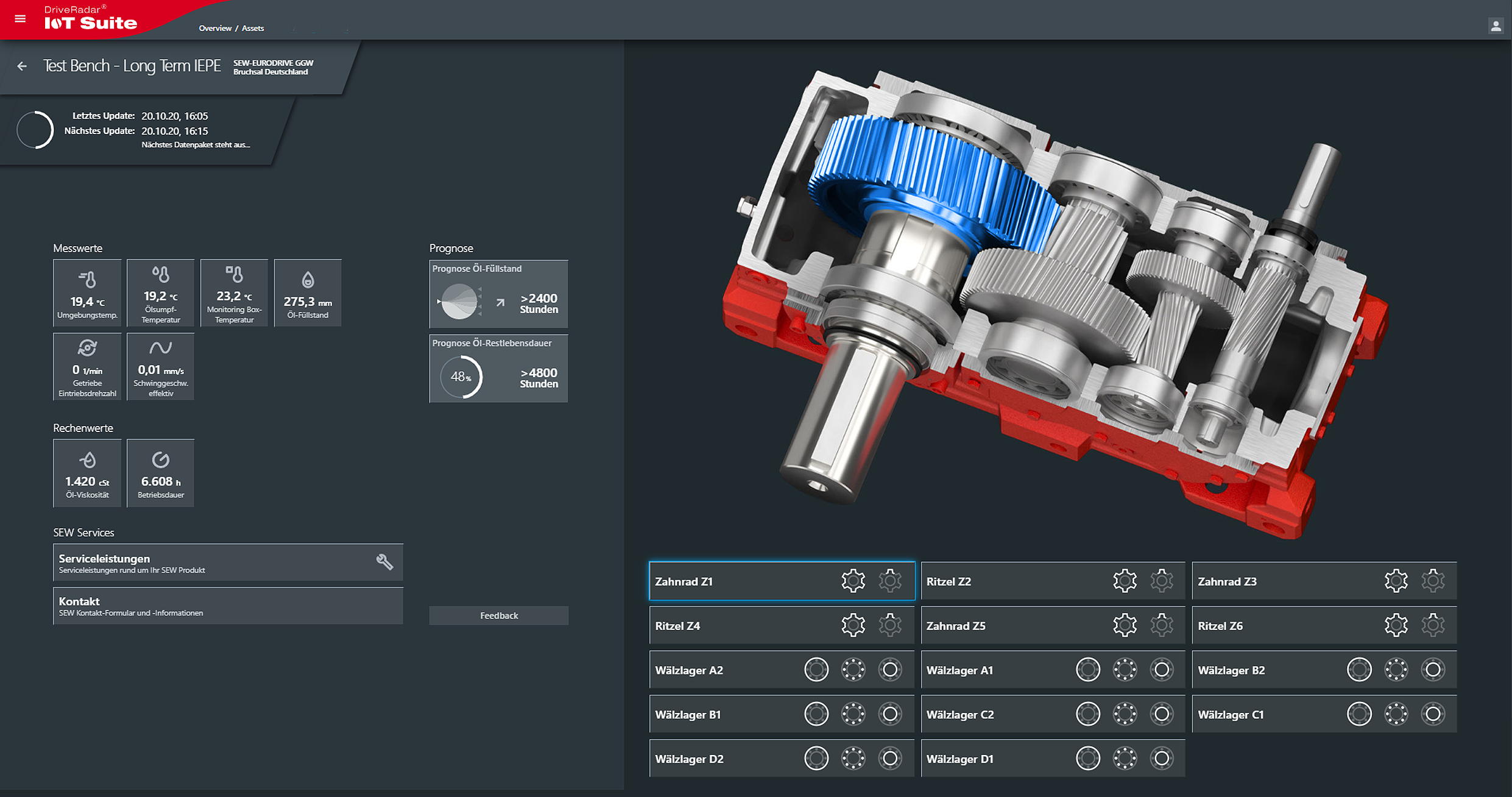 This means customers can determine the status of individual rolling bearings and their components (outer ring, inner ring, rolling elements) or predict when the next oil change will be required, for example. As a result, it is possible to plan maintenance and repairs for industrial gear units in advance and prevent failures.