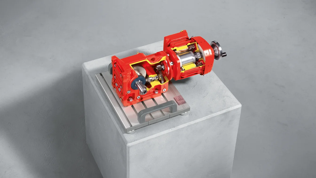 The didactics functional cut-away demo unit series for gear units clearly depicts the inner workings of a helical gear unit, helical-bevel gear unit, and helical-worm gear unit, as well as the way they interact with each other and how a gear unit works.